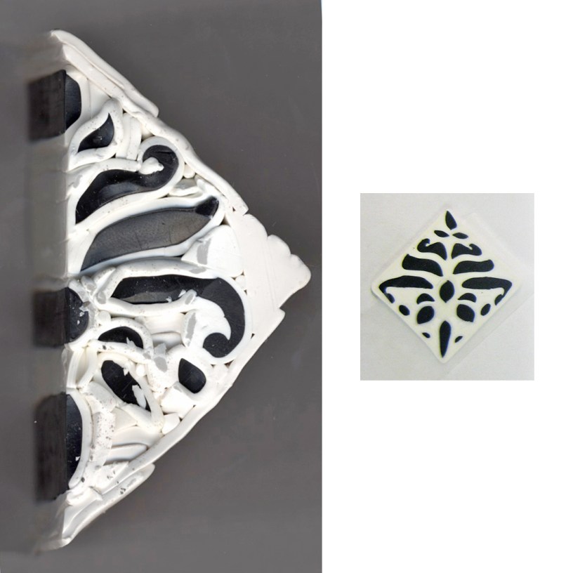 I love damask. I designed this cane and spent much time putting it together, but when I reduced it, it went horribly wrong. The nice curves were smashed against the sides. A lot of white clay squished out the ends, which should have told me things weren’t going well.