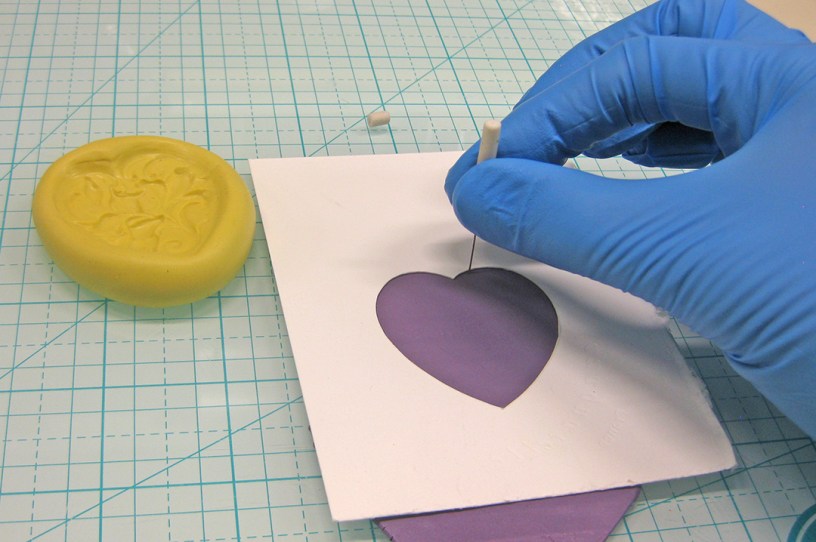 Cutting shape out of polymer clay to match the heart-shaped mold.