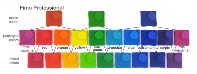 Fimo Pro (formerly called Fimo Classic) has a larger color range than what I’ve shown. I’ve found that the colors in the photo above, plus black and white, should be all that are needed to mix any color. The purple is a bit dark and shows its color better if mixed with a little white.