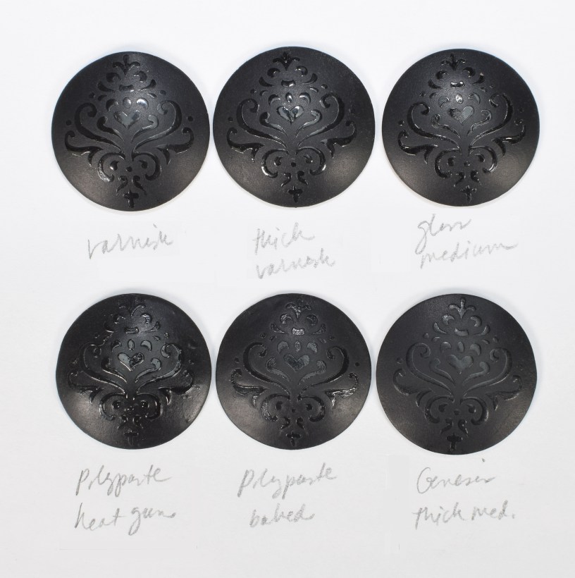 Plain Cernit Gloss Varnish was very shiny. Thickening it up makes it dome, which gives a nice effect. Golden Gloss Medium and Kato Poly Paste weren’t as smooth and domed as the others, even when Poly Paste was heated with a heat gun.