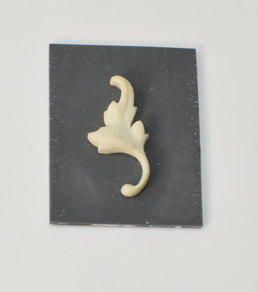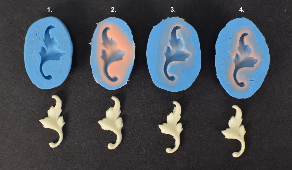 1. The first test on the left uses only two-part silicone mold putty. There are tiny bubbles in the front of the leaf and it doesn’t have a clean edge where the sides join the back. This means a lot of clean up with an Xacto blade and sandpaper.